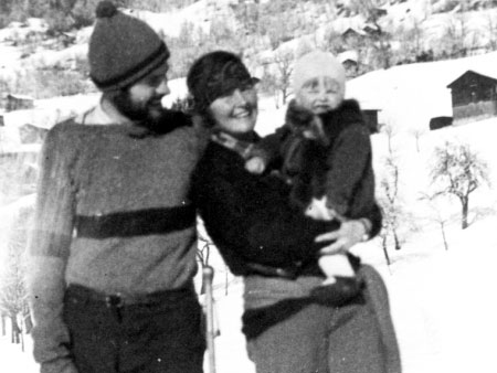 Ernest, Hadley and baby Bumby skiing in Austria in 1925